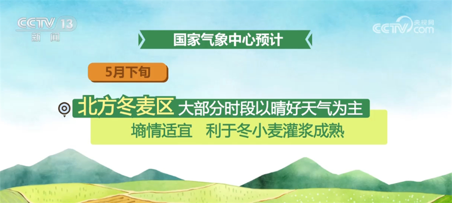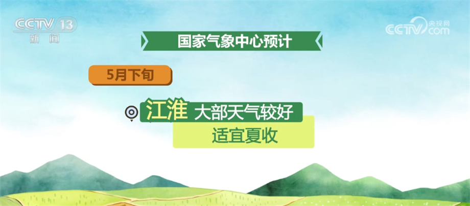 国家气象中心预计,5月下旬,北方冬麦区大部分时段以晴好天气为主,墒情适宜,利于冬小麦灌浆成熟;江汉、江南及四川盆地、贵州等地有较强降雨,夏收作业将短暂受阻;江淮大部天气较好,适宜夏收。