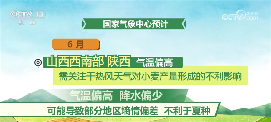 6月,西北、华北和黄淮冬麦区大部气温接近常年同期或偏高,大部地区降水接近常年或偏少,气象条件总体利于冬小麦收获晾晒;但山西西南部、陕西气温偏高,需关注干热风天气对小麦产量形成的不利影响,此外,气温偏高、降水偏少可能导致部分地区墒情偏差,不利于夏种。