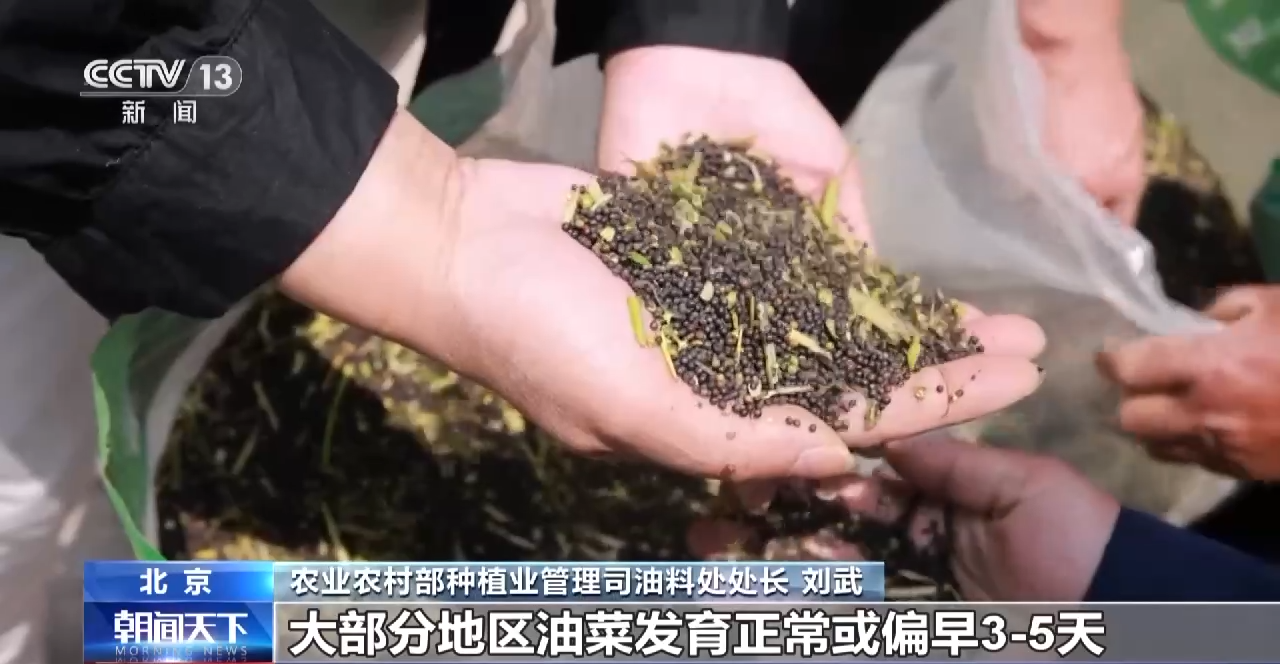 农业农村部种植业管理司油料处处长 刘武:大部分地区油菜发育正常或偏早3—5天,因面积增加较多,增产趋势明显,为提升全年油料产能和自给率夯实了基础。