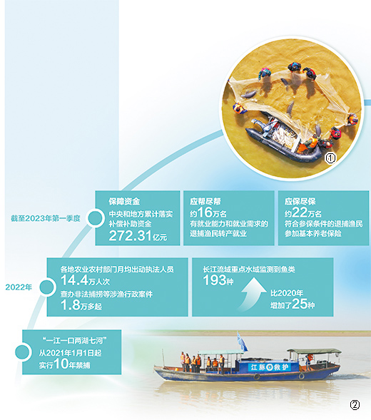 截至2023年第一季度,中央和地方累计落实补偿补助资金272.31亿元,有力保障禁捕退捕资金需求;约16万名有就业能力和就业需求的退捕渔民转产就业,实现应帮尽帮;约22万名符合参保条件的退捕渔民参加基本养老保险,实现应保尽保。目前,已有44890名退捕渔民领取养老金。