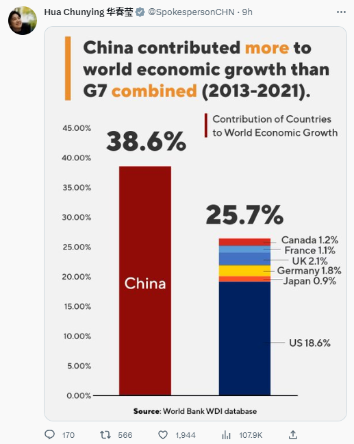 华春莹发的第二张图援引世界银行世界发展指标数据库的数据得出结论:2013年至2021年中国对世界经济增长的贡献率超过G7总和。图上的数据显示,中国、美国、日本、德国、英国、法国、加拿大对世界经济增长的贡献率分别为38.6%、18.6%、0.9%、1.8%、2.1%、1.1%、1.2%。↓