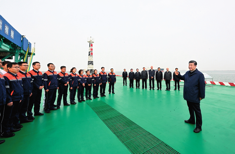 5 月 11 日至 12 日,中共中央总书记、国家主席、中央军委主席习近平在河北考察,并主持召开深入推进京津冀协同发展座谈会。这是 11 日下午,习近平在沧州市黄骅港煤炭港区码头考察时,同码头工作人员、船务人员亲切交流 李学仁摄 / 本刊