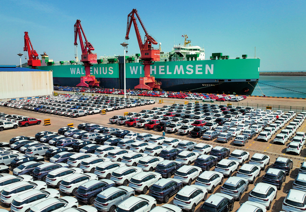 一艘滚装船在江苏连云港港东方港务分公司码头装运出口汽车(2023 年 5 月 16 日摄) 王健民摄 / 本刊