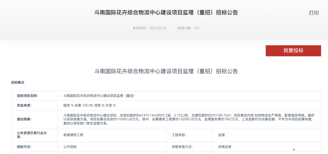 日前,云南省公共资源交易信息网发布《斗南国际花卉综合物流中心建设项目监理(重招)招标公告》,根据公告,斗南国际花卉综合物流中心建设项目,总规划面积约61474.14平方米(约92.2亩,6.15公顷),总建筑面积约291788.72平方米。