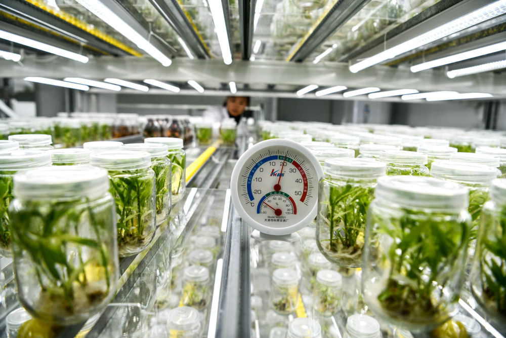 工作人员在贵阳市开阳县南江蔬菜良种繁育中心的组培中心查看姜苗生长情况(2023年5月23日摄)。新华社记者 杨文斌 摄