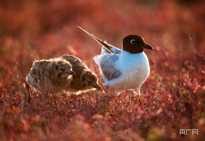 相比勺嘴鹬,另一名生态摄影师孙家录更喜欢一种乍看憨憨的候鸟——黑嘴鸥。虽名叫黑嘴鸥,但进入繁殖期的黑嘴鸥会“戴上黑头套”,变身“黑脸鸥”,通过换羽增强魅力,在条子泥求偶生子。
