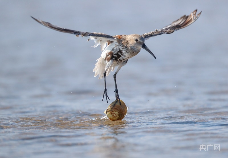 鹬蚌相“遇”:一只鹬被文蛤夹住了脚(央广网发 孙家录 摄)