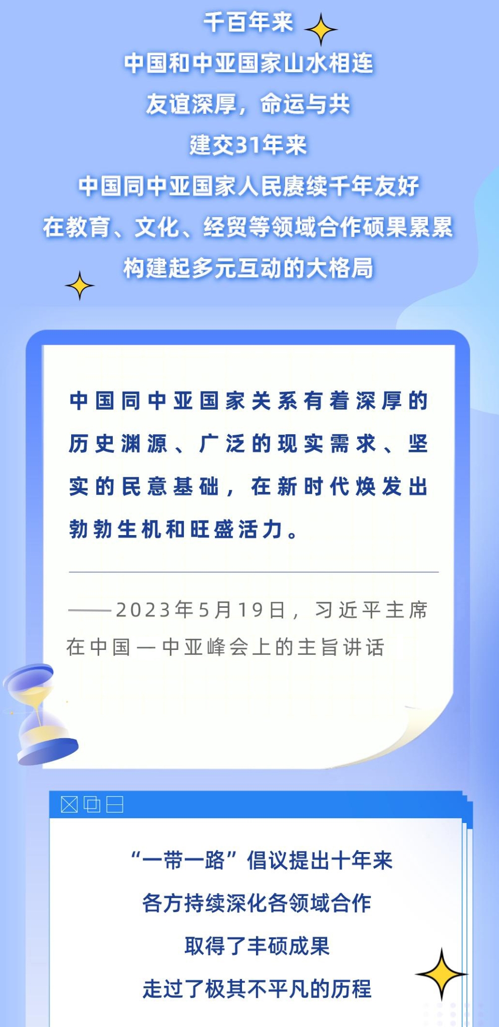 从去年1月的建交30周年视频峰会,到今年这次中国—中亚峰会,习近平主席同中亚五国元首连续两年集体会晤,并正式成立中国—中亚元首会晤机制,为中国—中亚关系发展作出战略领航。下面,让我们一起通过习近平主席的重要讲话,回顾中国与中亚国家源远流长的友谊、极其不凡的合作历程,读懂中国—中亚峰会的重要意义。