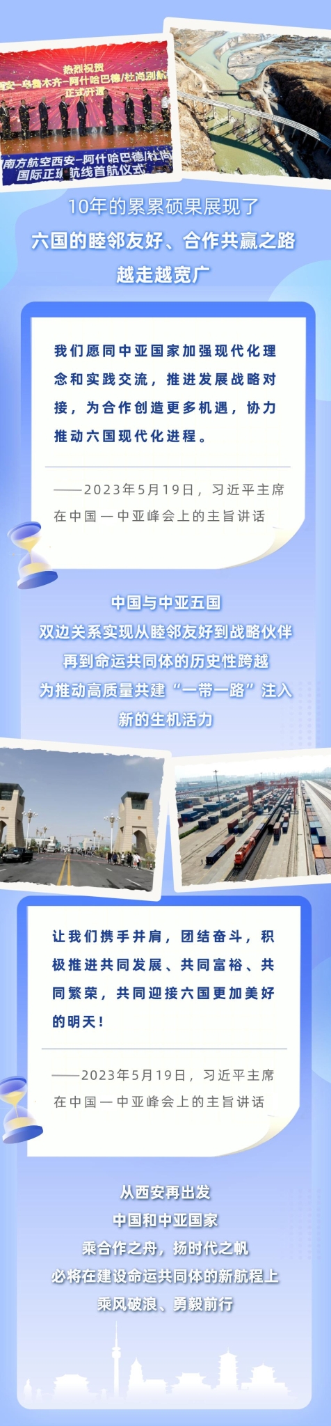 “今天我们在西安相聚,续写千年友谊,开辟崭新未来,具有十分重要的意义。”5月19日,习近平主席在陕西西安主持中国—中亚峰会,并发表题为《携手建设守望相助、共同发展、普遍安全、世代友好的中国—中亚命运共同体》的主旨讲话。