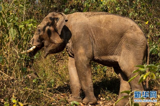 救助象“小强”在森林中觅食(3月11日摄)。新华网 刘云 摄