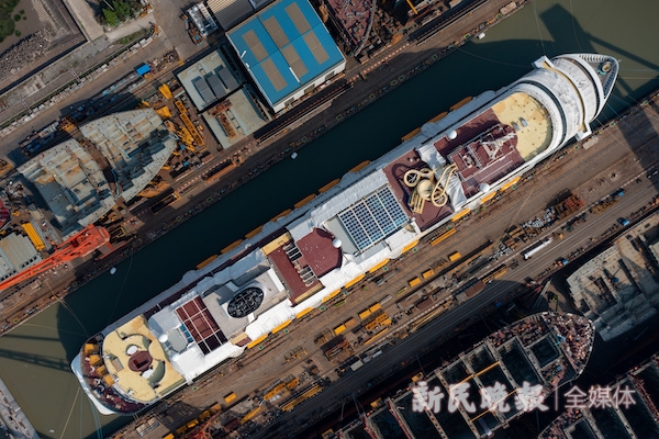 图说:空中俯瞰首艘国产大型邮轮 新民晚报记者 孙中钦 摄(下同)