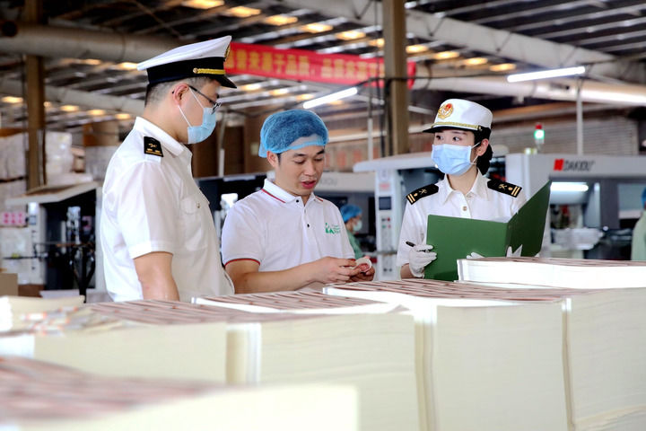 6月2日,南宁海关工作人员到南宁派吉纸业有限公司调研企业产品生产流程。新华社发(南宁海关供图)