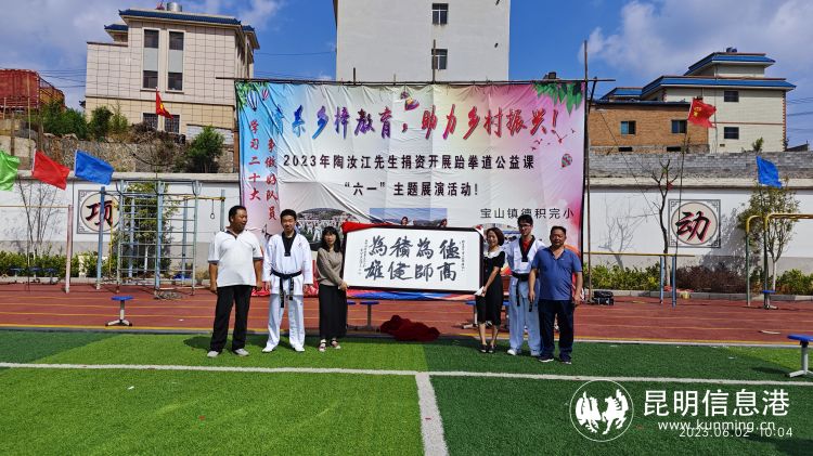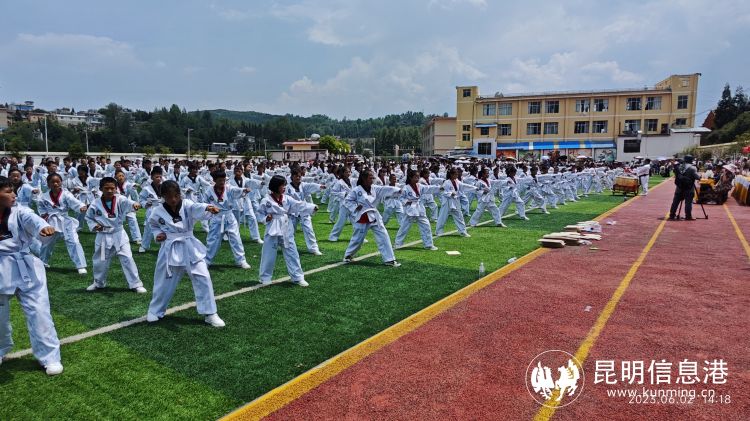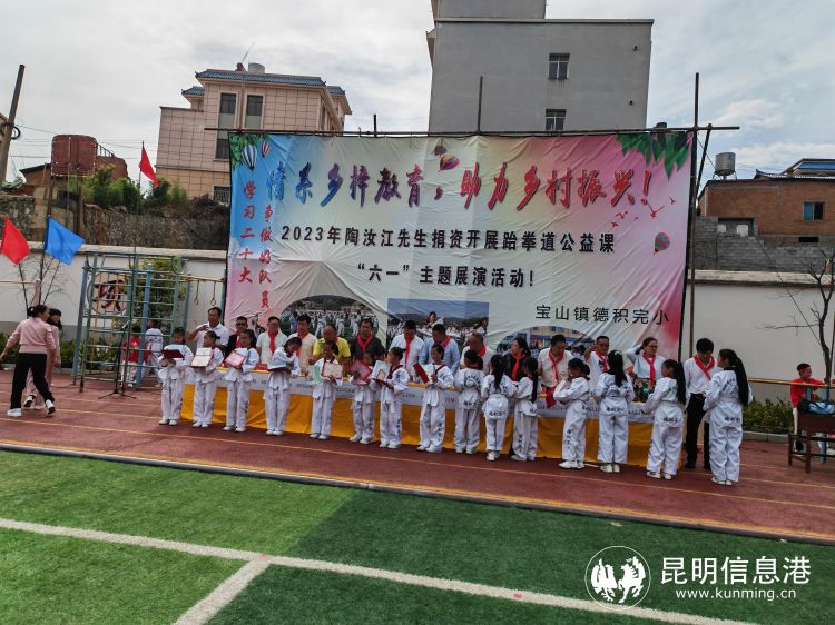 昆明信息港讯 记者戴兴 情系乡梓教育,助力乡村振兴。6月2日,宣威市德积完小小学生们借六一节日之际,用汗水铸就自信,给大家展示了他们将近一年刻苦训练的学习成果,呈上一台隆重的460人的跆拳道团体架型表演盛宴。