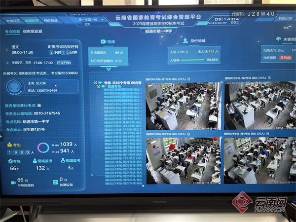 云南省招考院相关负责人介绍,我省国家教育考试考务指挥中心可以看到全省各个考区、考点、考场内的情况,一旦发现考生或监考有异常行为,可在第一时间通过视频指挥系统,通知考点考务人员及时处理。