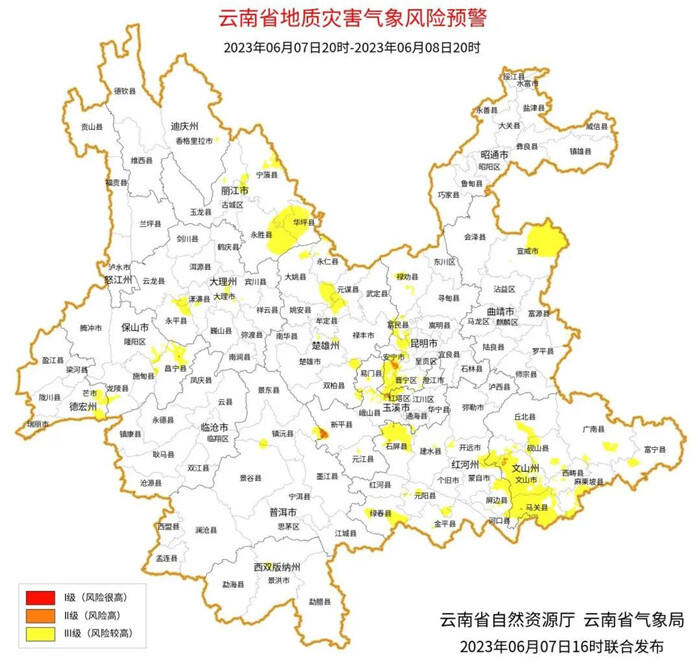 2023年06月07日20:00~06月08日20:00,昆明市安宁市、晋宁区,玉溪市新平县,普洱市镇沅县,保山市昌宁县,红河州石屏县,文山州文山市、马关县发生滑坡泥石流的风险高,昆明市西北部、西部、西南部,玉溪市西南部、北部,曲靖市东北部,楚雄州北部、中部、东南部,丽江市北部、东部,迪庆州东部,大理州中部、西南部,保山市东部、南部,德宏州东部,普洱市东北部、北部,红河州北部、西北部、西南部、南部、东南部,文山州西北部、西部、中部、东部、西南部发生滑坡泥石流的风险较高。
