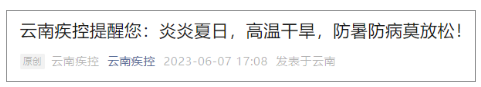 在高温天气下,人的机体长时间受到高温天气的影响,可出现体温中枢障碍,从而引起中暑。6月7日,云南疾控发布最新提醒,炎炎夏日,高温干旱,防暑防病莫放松。详情如下: