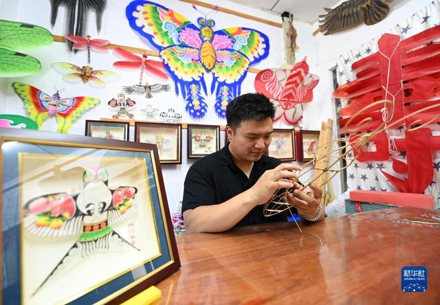 出身风筝世家的魏博文大学毕业后,回到家乡跟随父亲魏国秋“入行”做风筝。他从自己有所基础的绘画着手,发挥年轻人的创新优势,在风筝设计上屡屡出新,不仅与一些游戏公司合作推出风筝联名款,还推动风筝制作技艺的改进创新,设计了适合在室内放飞的迷你风筝。