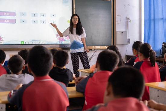 2022年9月30日,古生村科技小院研究生刘尚宜在大理市湾桥镇中庄完小为小学生上英语课。受访者供图