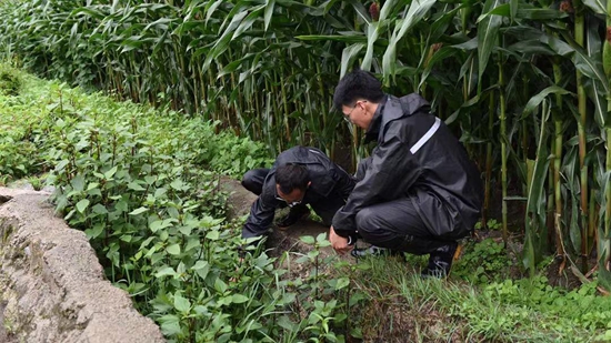 古生村科技小院的学生们冒雨在田边沟渠取水样。