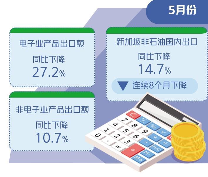 6月16日,新加坡企业发展局发布数据显示,5月份非石油国内出口(NODX)同比下降14.7%,与4月份相比,下降幅度继续加大。由于电子和非电子业产品出口额均下滑,导致5月份NODX连续8个月下降,整体表现不如市场预期。