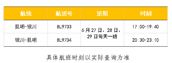 据悉,祥鹏航空昆明=银川直飞航线航班号为8L9733/4,每天一班,去程航班17:00从昆明长水国际机场起飞,19:40抵达银川河东机场;返程航班20:30从银川河东机场起飞,23:10抵达昆明长水国际机场。