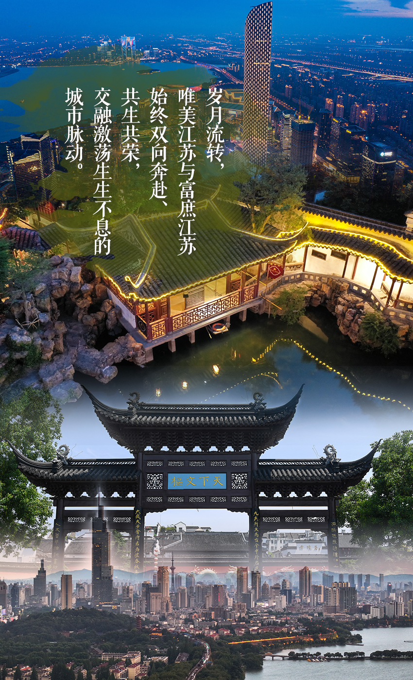 岁月流转,唯美江苏与富庶江苏始终双向奔赴、共生共荣,交融激荡生生不息的城市脉动。