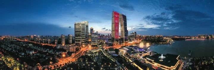 苏州金鸡湖湖滨公园与东方之门。(无人机全景照片 2020年7月30日摄)新华社记者杨磊 摄