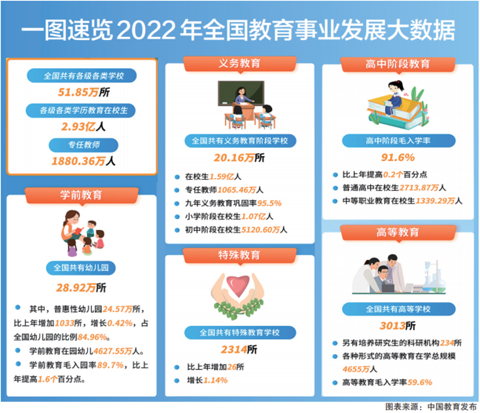 今天,教育部发布2022年全国教育事业发展统计公报。公报显示,全国共有各级各类学校51.85万所,各级各类学历教育在校生2.93亿人,专任教师1880.36万人。