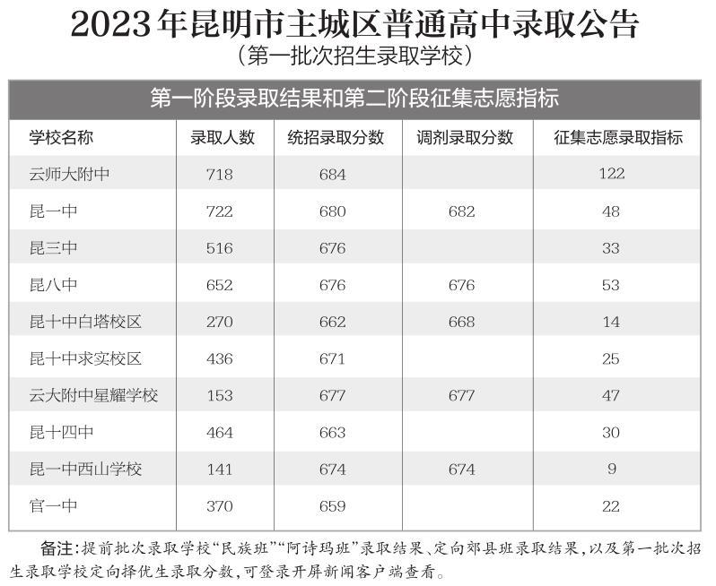 7月6日,昆明市招生考试院发布2023年昆明市普通高中录取公告,公布了提前批次录取学校“民族班”“阿诗玛班”录取结果、定向郊县班录取结果,同时公布了主城区第一批次招生录取学校第一阶段录取结果和第二阶段征集志愿指标、定向择优生录取分数,以及可参加征集志愿录取的主城区考生分数段。