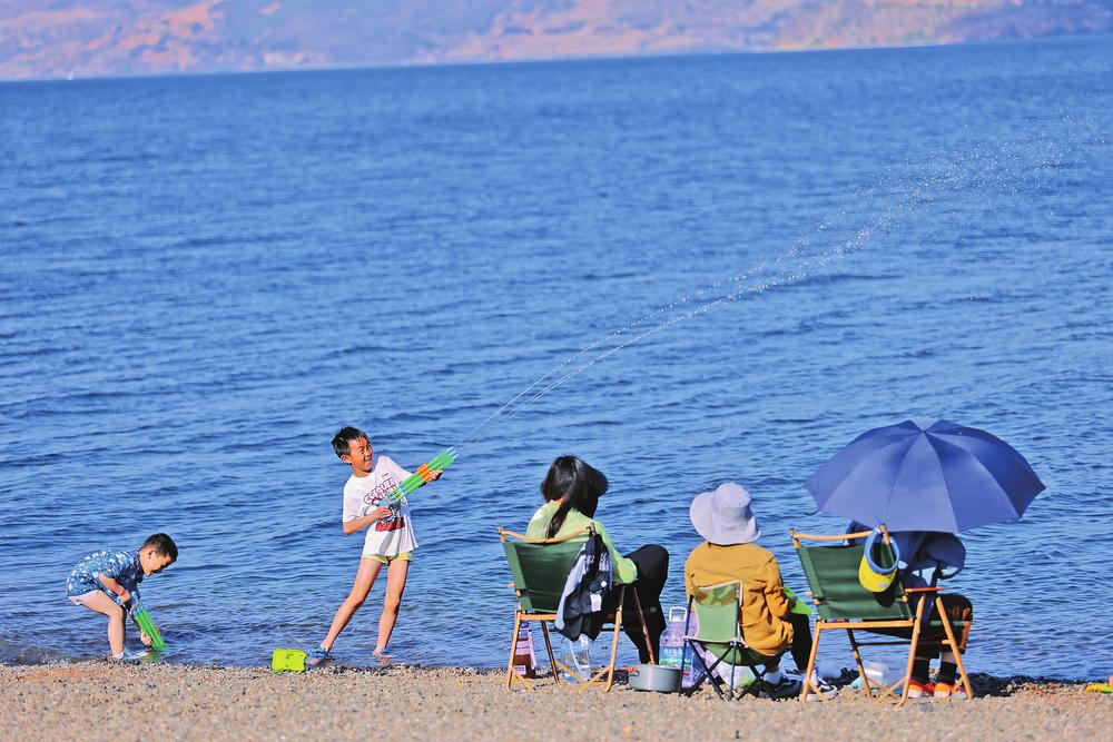 随着气温攀升,不少市民、游客到抚仙湖边玩水消热。 本报记者 胡妤雅 摄