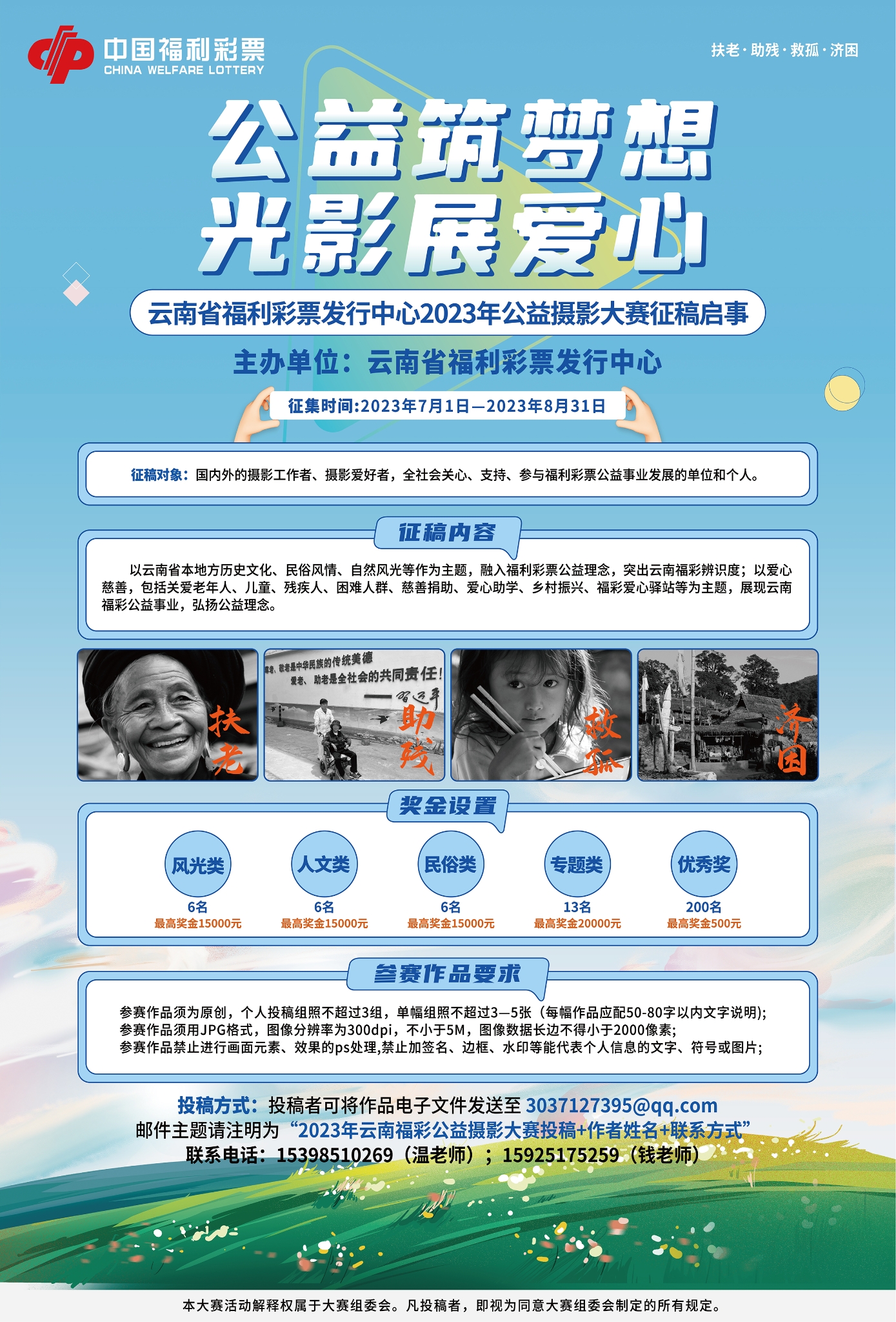 目前,2023云南福彩公益摄影大赛还在持续征集作品中,国内外的摄影工作者、摄影爱好者,全社会关心、支持、参与福利彩票公益事业发展的单位和个人可将参赛作品以电子文件的形式发送至3037127395@qq.com邮箱。邮件主题请注明为“2023年云南福彩公益摄影大赛投稿”,并在邮件正文中注明:“本人(或团队)承诺所提交的作品为原创且无争议,若产生版权、肖像权或其他任何法律纠纷,将自行承担全部法律责任。