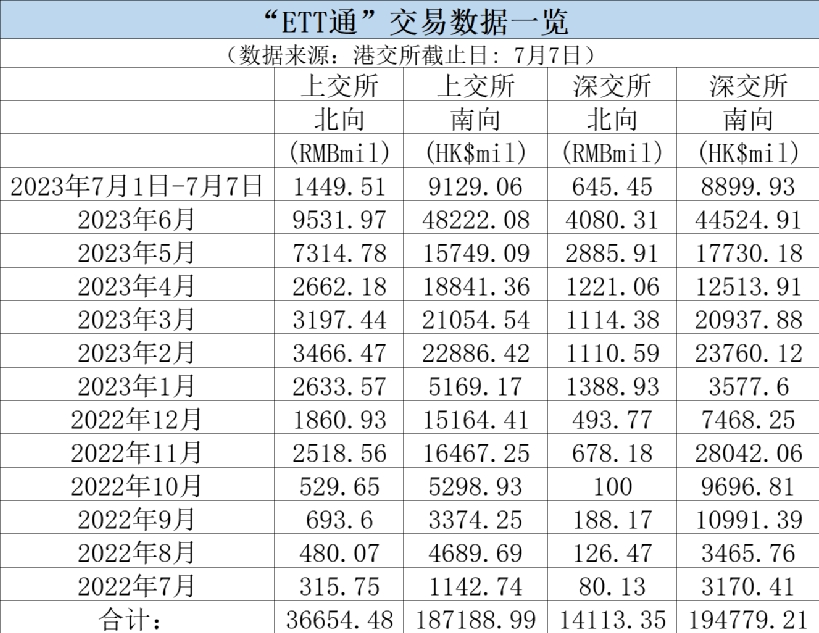仅从7月短短5个交易日来看,ETF通的“南向”和“北向”的成交金额都较大。港交所数据显示,7月1日至7月7日,“陆股通”的成交金额合计达到20.95亿元人民币;“港股通”方面,7月以来成交金额为180.03亿港元。若从开通以来的整体数据看,“陆股通”合计成交额度达到507.68亿元人民币,而“港股通”更是达到3819.68亿港币。