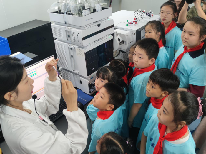7月11日,在武汉市食品化妆品检验所,工作人员向孩子们展示食品检测过程。 (武汉市市场监督管理局供图)