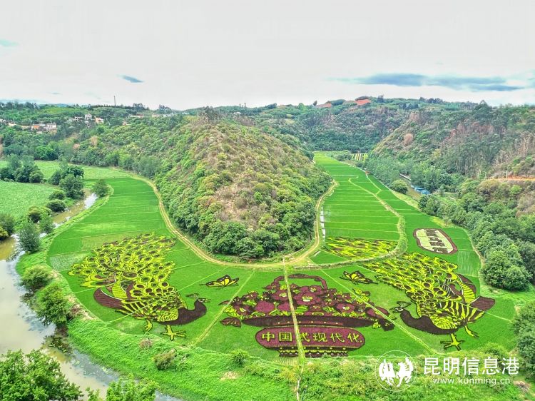 据介绍,今年的彩色稻田,依托“河湾”和“马蹄湾”的自然地理优势,描绘了一幅彝族大地之母怀抱大地之子的祥和画面,象征着大地的勃勃生机,生命的生生不息。另一片稻田中,两只祥瑞孔雀彩翼舒展,环绕着由宜良县花三角梅和石榴组成的花篮,展现了勤劳智慧的宜良人民像石榴籽一样团结在一起。其中,每一只孔雀都由6871个点位的精心拼插而成,只为“孔雀”的羽毛颜色能更艳丽、更逼真。