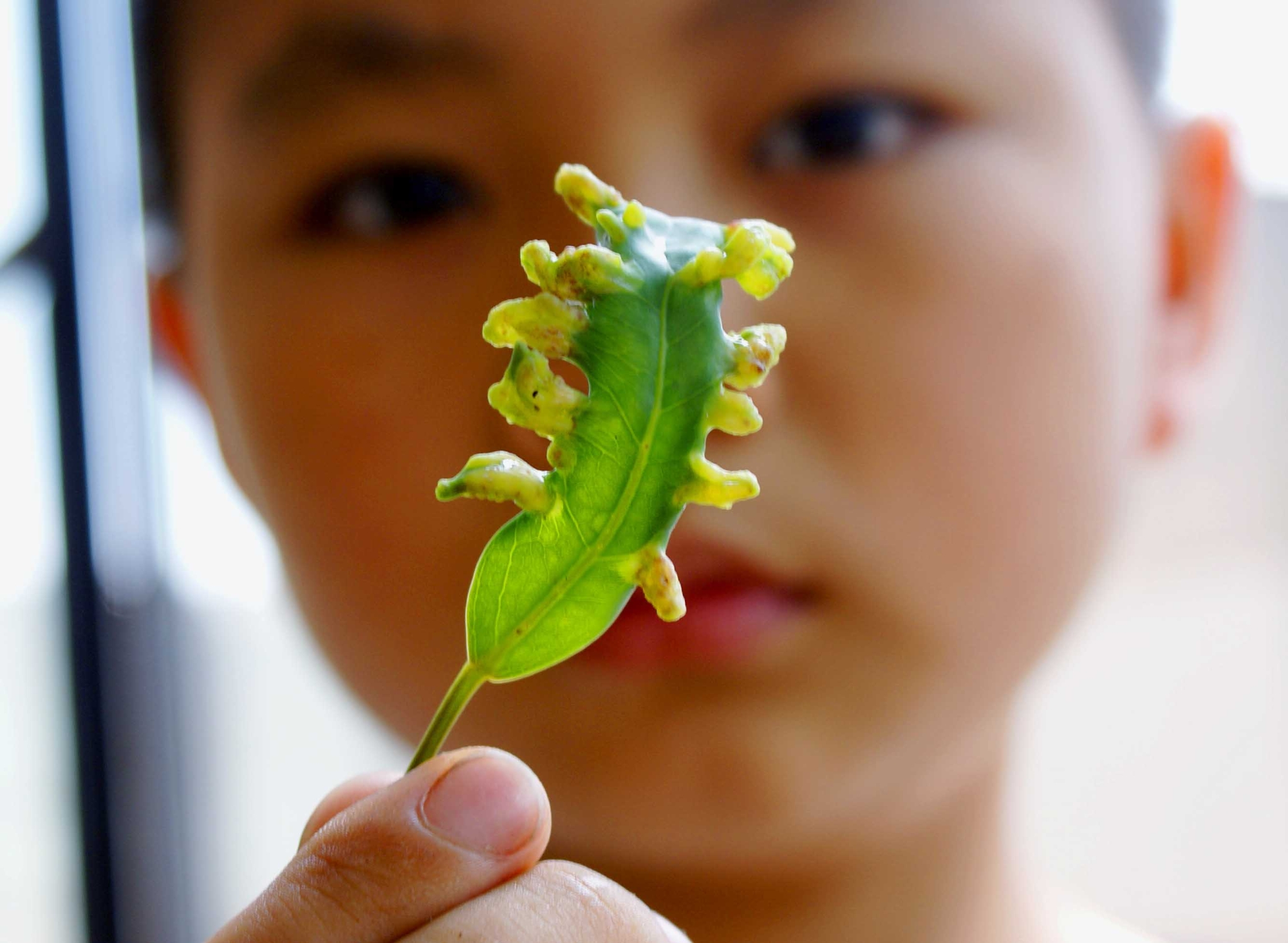小昆虫在鸭脚木树叶上建起的“高楼大厦”