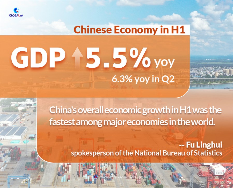 * China's gross domestic product (GDP) grew 5.5 percent year on year in the first half (H1) of 2023, data from the National Bureau of Statistics (NBS) showed Monday.
