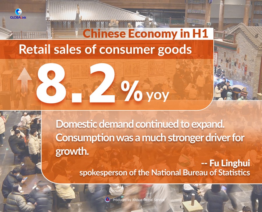 China's retail sales of consumer goods went up 8.2 percent year on year in the first half of this year, 2.4 percentage points faster than that of the first quarter, the NBS spokesperson pointed out. Retail sales of consumer goods totaled around 22.76 trillion yuan in H1. In June alone, retail sales edged up 3.1 percent year on year.
