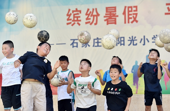 暑假期间,为减轻家长负担,有效缓解学生暑期“看护难”问题,部分学校、社区开展暑期免费托管,为学生提供作业辅导和素质课程等服务,让孩子们度过一个快乐、有意义的假期。 图为7月10日,在石家庄市阳光小学,学生进行足球训练。张晓峰/摄(新华社发)