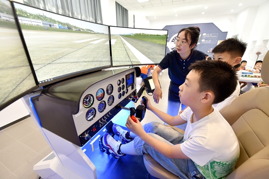 7月10日,在石家庄市融创中心第一小学,学生在老师的指导下进行飞行模拟驾驶。张晓峰/摄(新华社发)