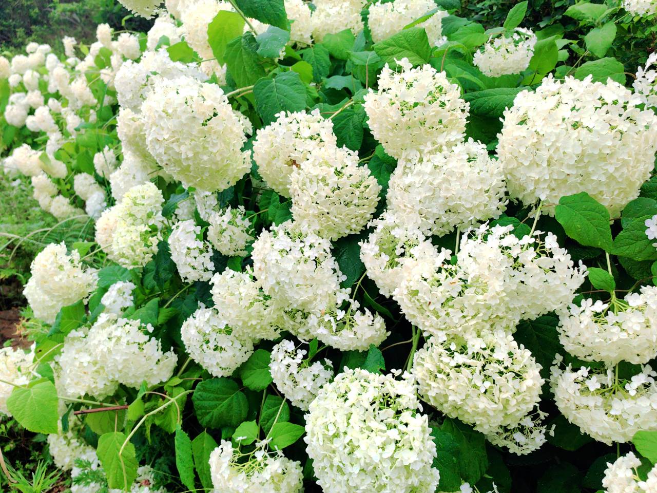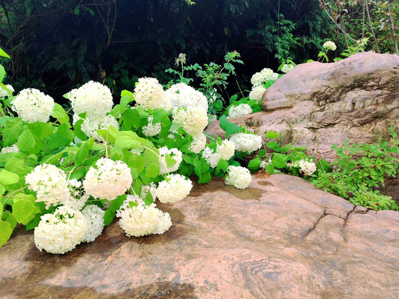 雨中的绣球枝繁叶茂,宛若新生,椭圆形的宽大叶子青翠舒展,每片叶子每个花球都托着新鲜的雨珠,色泽明艳动人,晶莹的雨珠沿着叶面流动、聚集、滴落,姿态楚楚可人。被绣球花点缀的青山绿水宛如童话世界!