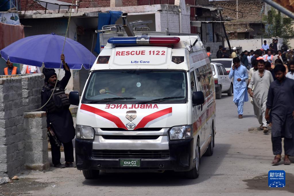 7月20日,在巴基斯坦西北部开伯尔-普什图省开伯尔部落地区,救护车抵达连环自杀式爆炸袭击事件现场。巴基斯坦西北部开伯尔-普什图省7月20日发生一起连环自杀式爆炸袭击事件,目前已造成至少4人死亡,另有多人受伤。新华社发(赛义德·艾哈迈德 摄)