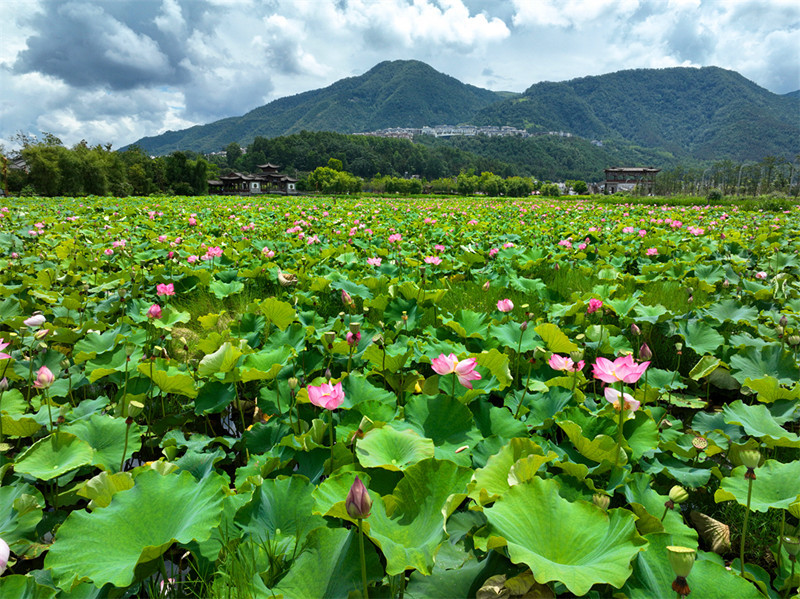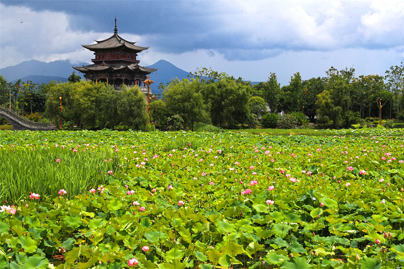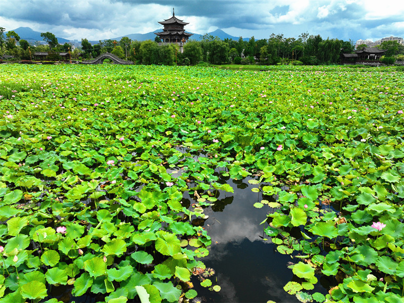云南保山腾冲市区的东湖公园占地面积1252亩,其中亭台楼阁、水榭廊桥勾勒出风雅景致,湖面种养荷花,每当夏日风起,绿叶随微风卷舒,荷花随清风摇曳,荷香沁人心脾,是观赏“接天莲叶无穷碧,映日荷花别样红”的绝佳之地。刘正凡 摄
