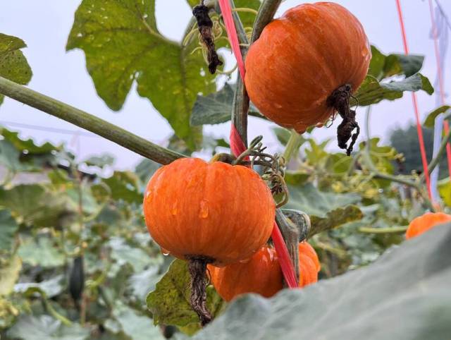 茭瓜喜获丰收,村里家家户户门前挂满的南瓜也个个圆润饱满、色泽鲜艳,将滴未滴的雨珠悬在瓜身,更显南瓜鲜嫩水润,煞是喜人。