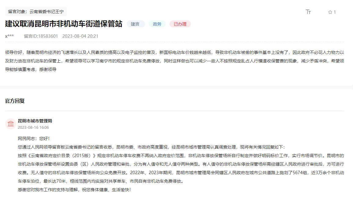 对于网友提出“取消昆明市非机动车街道保管站,让非机动车免费停放”的建议留言,昆明市城市管理局8月16日进行了回复。