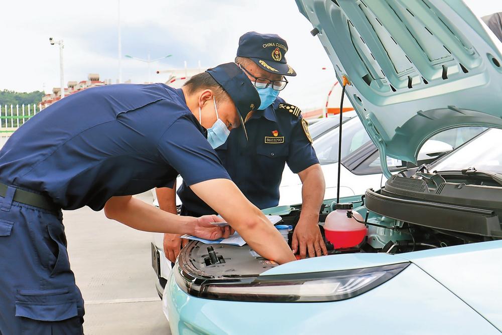 海关关员对出口新能源汽车进行查验。 本报通讯员 孙锐 摄