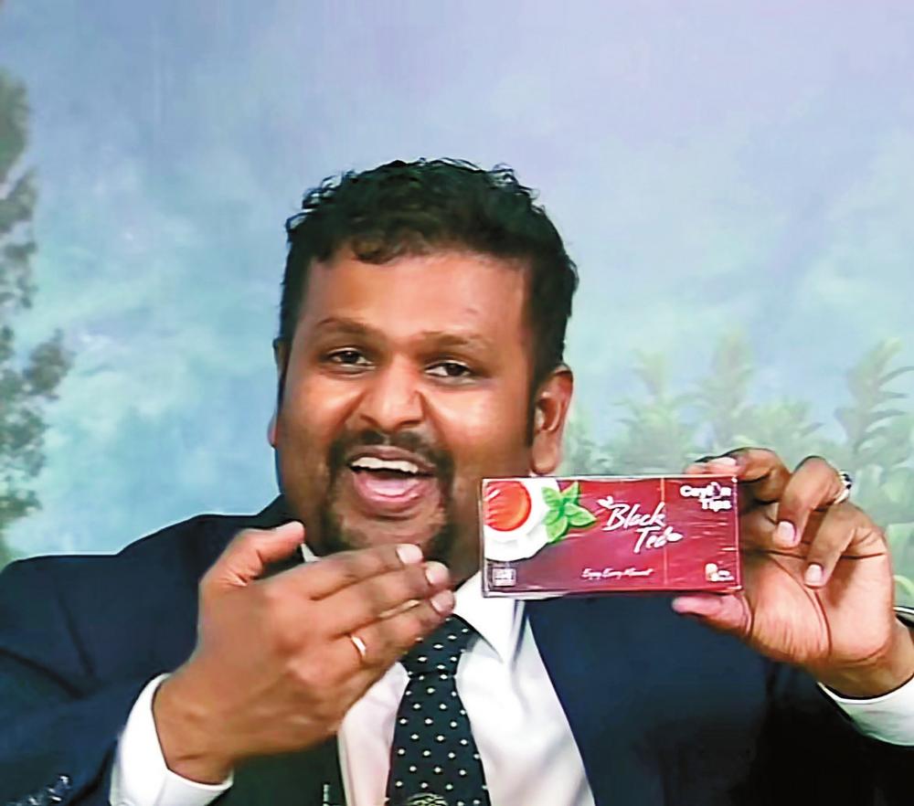 图为中国斯里兰卡经贸合作商会主席晋兰加介绍红茶。