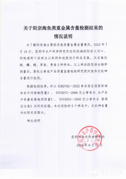 随着阳宗海保护治理不断深入,湖体水质持续改善,今年,1至8月全湖平均水质达到二类水质。今年7月,阳宗海管理所委托第三方检测机构对此次生态调控捕捞的鲢、鳙、鲤、草、青5种鱼类进行无机砷含量检测,结果为小于0.04mg/kg,远低于我国无公害食品水产品鱼体无机砷≤0.1mg/kg的要求,阳宗海5种鱼类均符合国家食品安全标准。