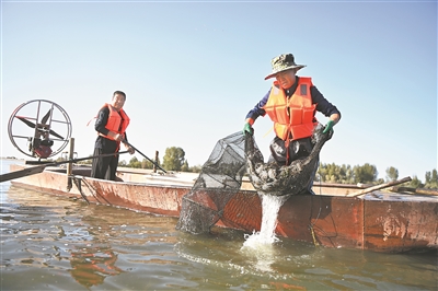 甘肃省张掖市高台县黑泉镇工作人员在捕捞养殖的螃蟹。