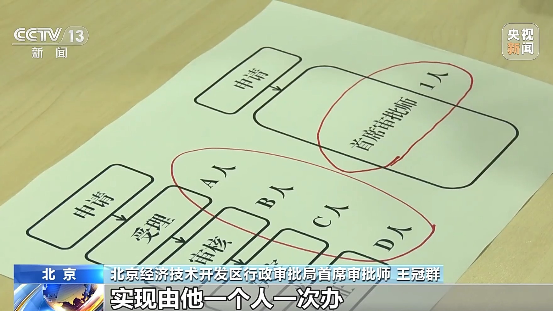北京经济技术开发区行政审批局首席审批师 王冠群:原来企业交了材料之后,要经过受理、审核、决定、发证这样多级多人的办理,才能最终拿到许可,推出了“首席审批师”这个制度之后,我们对一名“首席审批师”进行授权,实现由他一个人一次办。