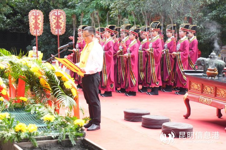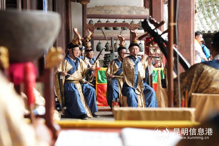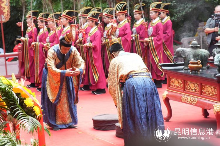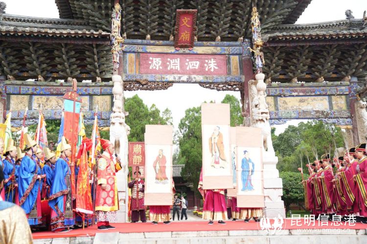 祭孔大典分为请圣、祭拜、送圣三个仪程,分别在在文庙洙泗渊源坊、先师殿进行。请圣仪程中,“斯文在兹,内外肃静,列位肃立,恭请圣像”,总提调话音刚落,洙泗渊源坊正中,一行人即举着孔子及四配画像上场。在他的指挥下,参礼者三鞠躬“向孔圣像行礼”便可依次行至大成门。“鸣炮三响,点燃圣火,开启大成门,恭请圣像入殿”,意味着请圣仪程完成。第二个环节祭拜仪程需要诵读祭文,而后进行初献、亚献、终献三个环节。初献主要以水果、酒、帛、肉、葱、韭菜等作为献礼;现场,亚献以歌咏《秩平之章》为主,只见献礼者摇麾起舞,恢弘大气;终献则歌咏《叙平之章》《德平之章》,以上礼成后,意味着祭祀已毕,进入到了送圣仪程。观看线上直播的网友不断刷屏:“不愧是滇南邹鲁、文献名邦”,“咱们的中华文化就应该这样传承,真是人杰地灵”......